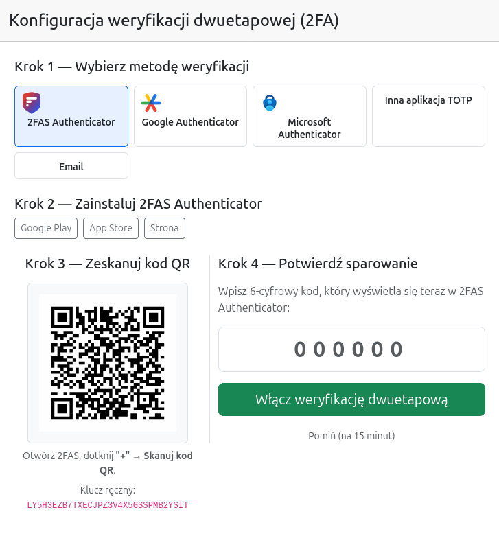 Krok 2 — Konfiguracja aplikacji TOTP (2FAS / Google / Microsoft)