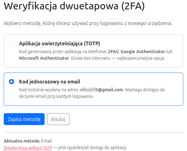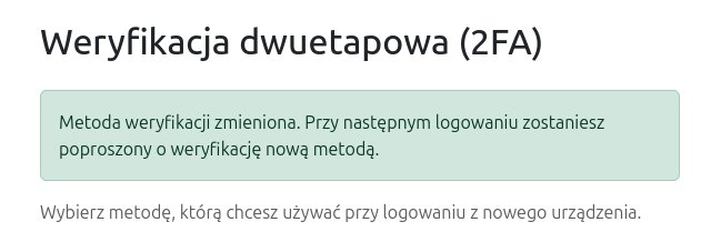 Po zmianie metody wszystkie zaufane urządzenia są unieważniane — przy następnym logowaniu wymagana będzie weryfikacja nową metodą.