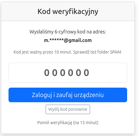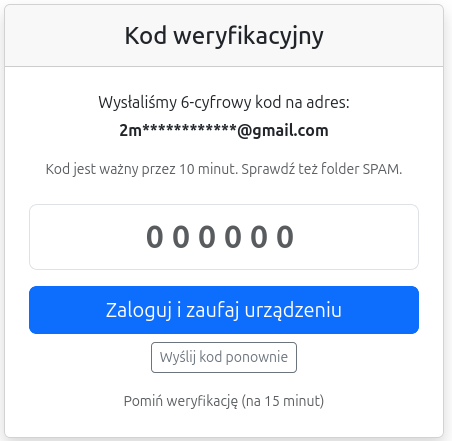 - Na Twój adres e-mail zostanie wysłany jednorazowy 6-cyfrowy kod (ważny 10 minut).